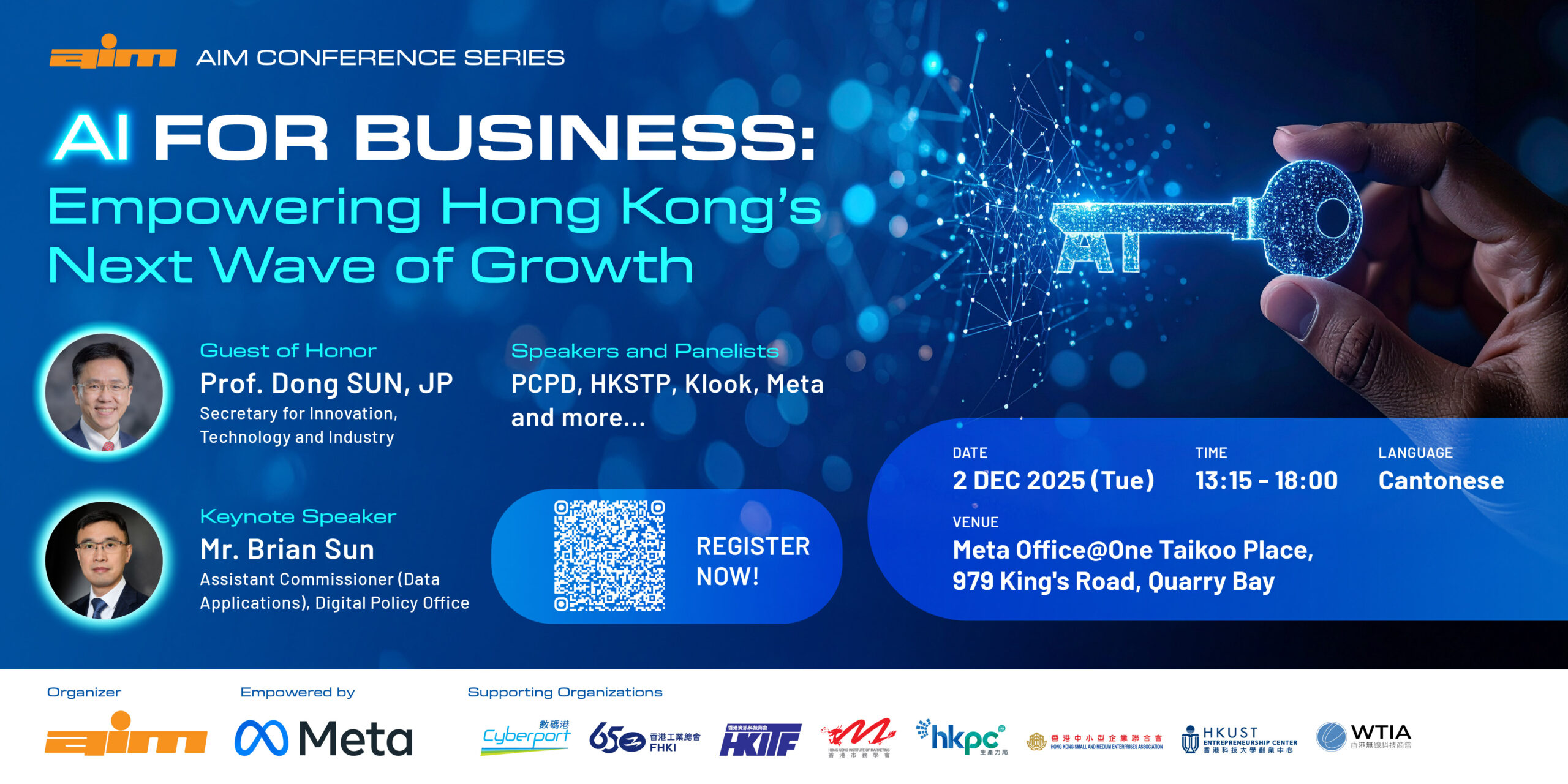 香港正全速邁向人工智能(AI) 賦能經濟發展,如何運用AI提升生產力、推動企業成長、優化行銷及營運效率,是中小企和各行業的致勝關鍵。香港互動市務商會 (AIM) 繼年初成功舉辦【香港AI治理研討會】後,再次匯聚政府高層、各行業翹楚、科技創新及營銷專家,於2025年12月2日主辦【AI 驅動商機 解鎖發展新動能】研討會。
