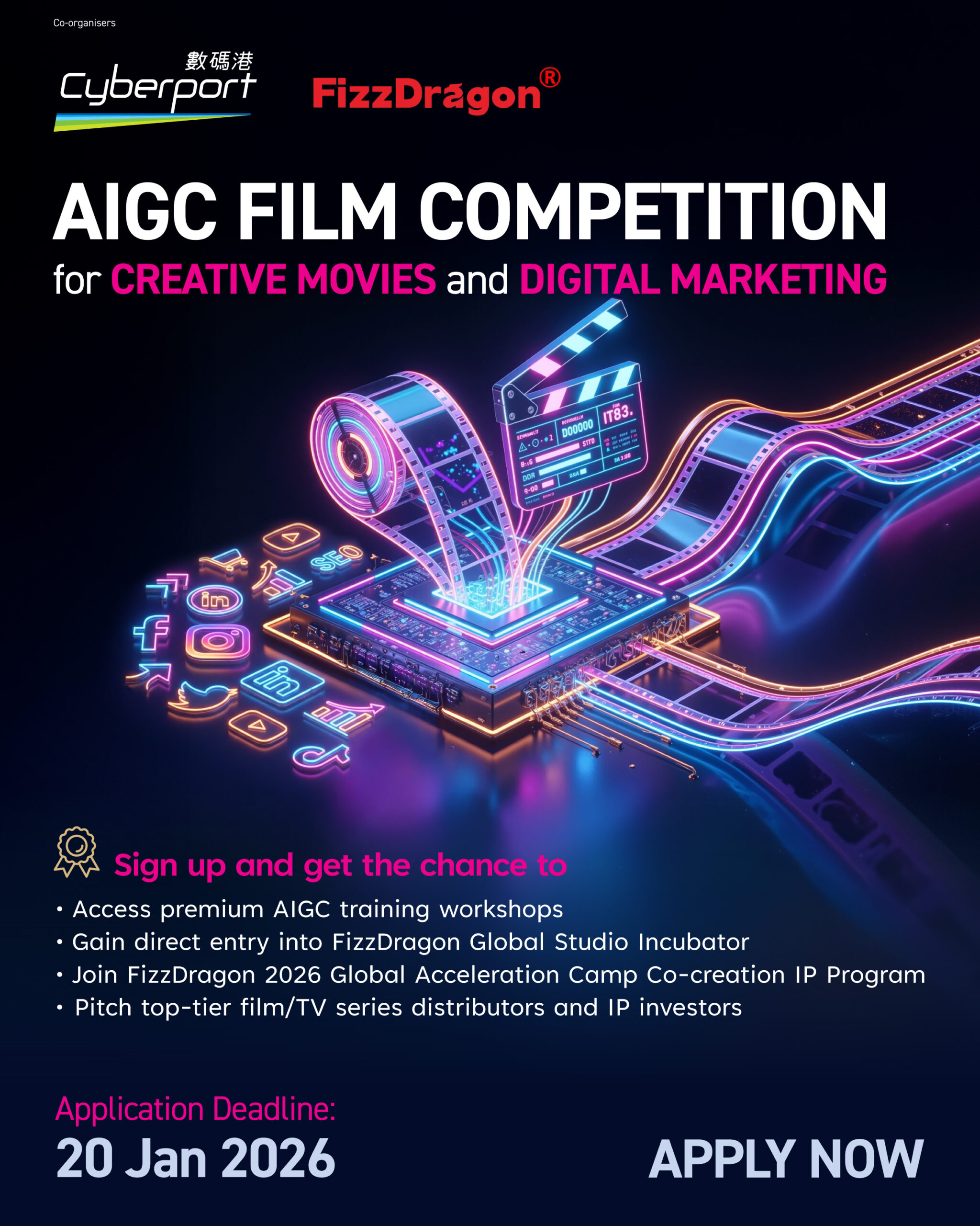 把握最後機會,報名參加由數碼港聯同FizzDragon合辦的 「AIGC 創意電影及數碼營銷比賽」,運用 FizzDragon 影片生成工具,將靈感轉化為可展示的實戰作品!